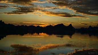 这张摄影作品捕捉了日落时分的宁静之美,远山如黛,剪影效果明显,营造出一种神秘而壮丽的氛围。色彩方面,天空的暖色调与水面的冷色调相互映衬,形成了鲜明的对比,增强了视觉冲击力。水面倒影清晰,进一步增强了画面的层次感和空间感。构图上,地平线位于画面中间,使得画面平衡,天空和水面各占一半,突出了日落的壮观景象。整体而言,作品主题明确,氛围营造出色,是一张具有一定水准的风光摄影作品。如果在拍摄时能注意细节,例如增加一些前景元素或者捕捉到更具特色的云彩,作品的艺术性将会得到进一步提升。