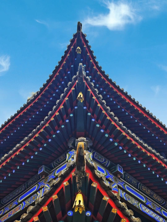 蓝天下,古建檐角如巨笔,绘就中式浪漫。朱红梁架、鎏金风铃、彩绘斗拱,细节藏着往昔匠人的巧思,每一处弧度,都是历史与艺术的温柔对话 。