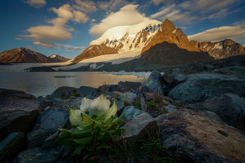 在博格达峰下冰川湖的岸边,一朵雪莲花静静开放。