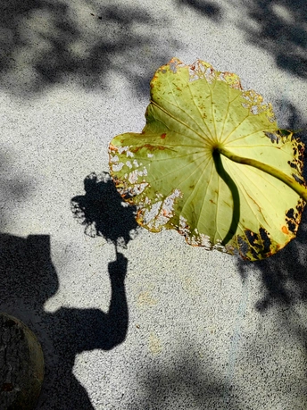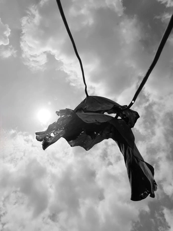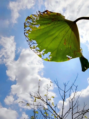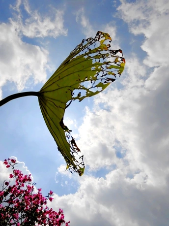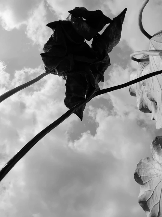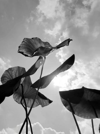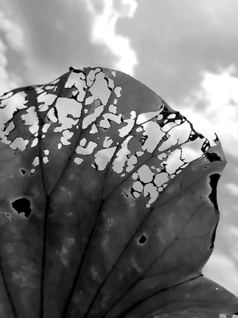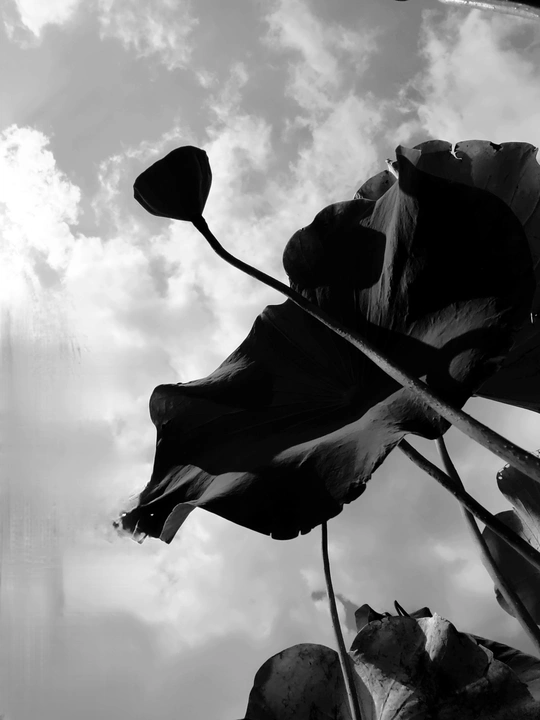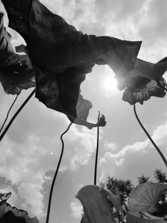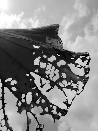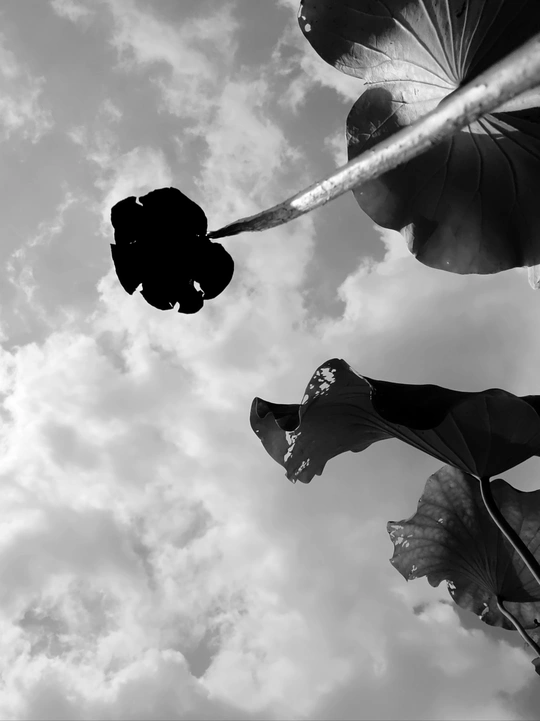 图一:这张黑白摄影作品捕捉了残缺的荷叶在阳光下的独特姿态,展现了一种生命流逝的美感。从低角度仰视,荷叶占据了画面中心,与天空中的云朵形成了对比,增强了视觉冲击力。光线透过荷叶,凸显了叶脉的纹理,营造出一种宁静而略带伤感的气氛。构图简洁,主题明确,能够感受到摄影师对自然细微之处的观察和表达。黑白的处理方式也赋予了作品一种古典和怀旧的意味。