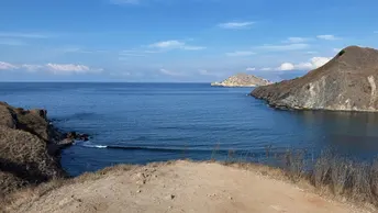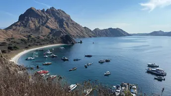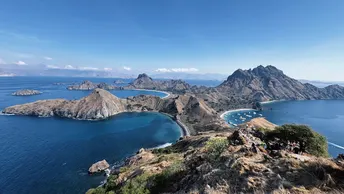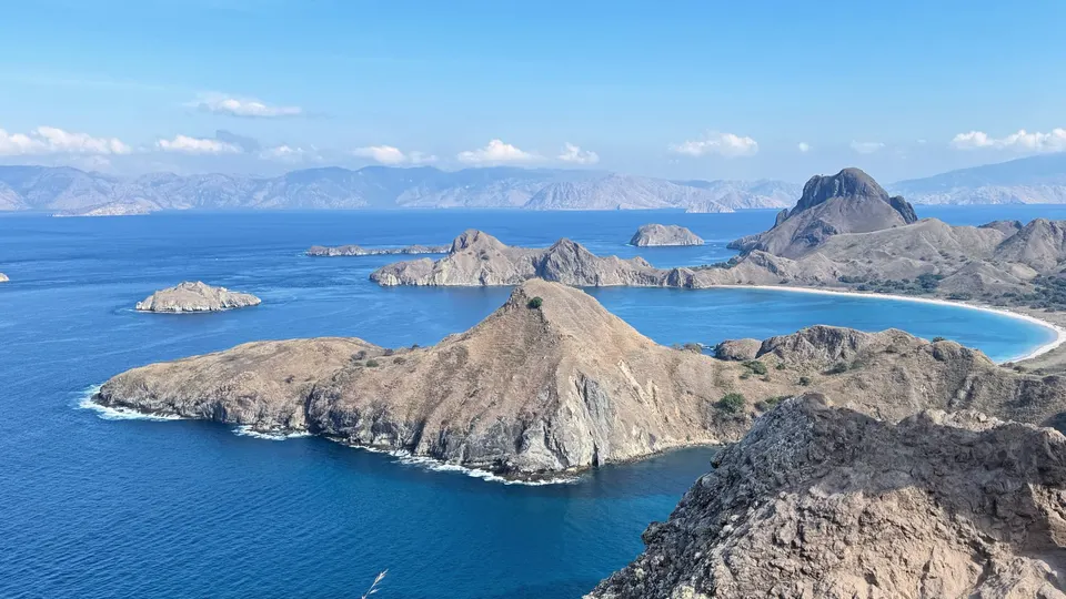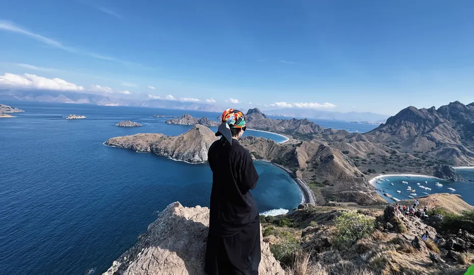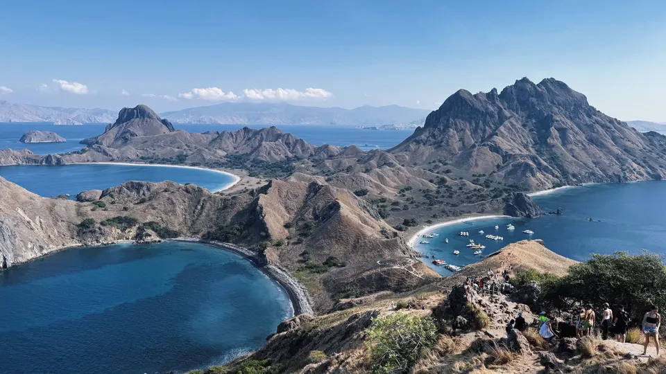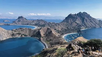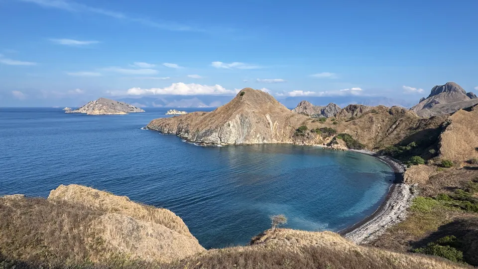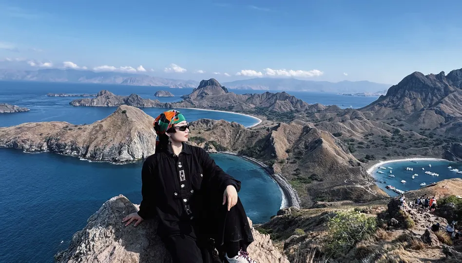 早起hiking 登陆帕达尔岛?️ 这里被称为“人间塞尔达” 脚下是粗粝的岩石 要看到最美的景色 你需要顶着太阳 登上山顶 三个新月形的海湾交错而立 彼此间被山脉相隔 仿佛来到海湾版的中土世界 在1991年科莫多国家公园 被评选为世界遗产的53年前 帕达尔岛就已被列为自然保护区 七千万年前的火山喷发 造就了这座岛屿崎岖的地貌 也是世界上唯一拥有四个深海湾 且每一处海湾 都有着不同颜色沙滩的地方(黑白粉金)