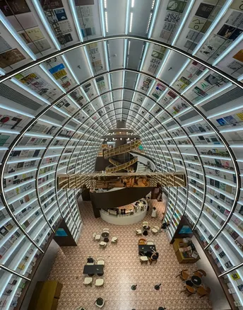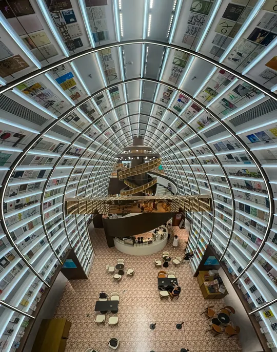 拱形书架如知识隧道,螺旋楼梯像智慧藤蔓,把空间拧成文化漩涡。色彩柔和,书脊的斑斓与暖光相融,氛围感直接拉满。光影在书页间跳舞,每本书都泛着知识的高光。