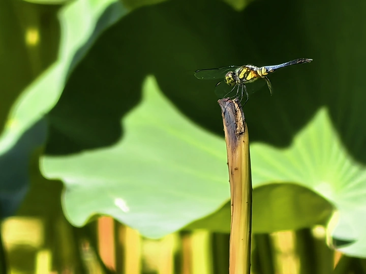 夏日里,蜻蜓立于荷茎,翅膀透亮如纱,在绿意间停歇,似与荷塘私语,把这小美好定格在时光里。