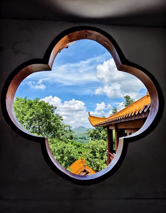 框景为画,禅意自成。檐角与远山勾勒空间纵深,树影同云朵描摹动静层次。一方花窗,将天地装裱成灵性画作。