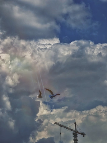 云层裂开金线,丁达尔光在秋日里拉出光的形状。塔吊划破天际,鸟儿振翅掠过光柱,像两粒倔强的星子坠入人间烟火。