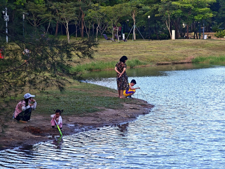 湖边,人们各自与水嬉戏,或静静观察,或动手探寻,在这方小天地里,享受着与自然亲近的悠闲时光。