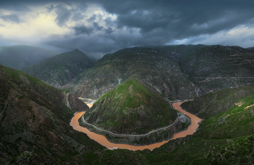 金沙江在峡谷中画出优美大拐弯,赤黄江水似绸带缠绕青山。云雾在山间游走,给群峰蒙上朦胧纱衣,天地间,尽是大自然写就的磅礴散文诗。
