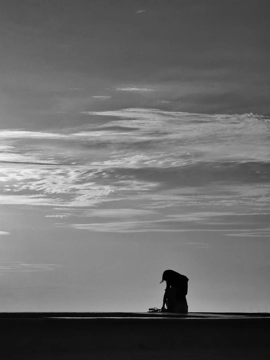 在汕头东海岸堤坝上,有一女人盘坐着,正在冥思遐想,远看似一塑像。