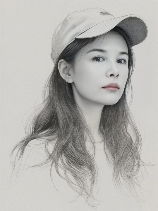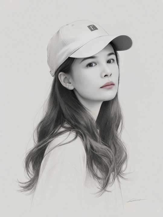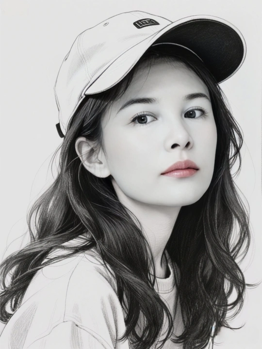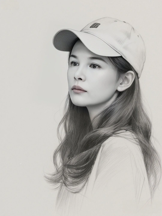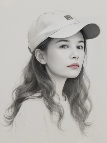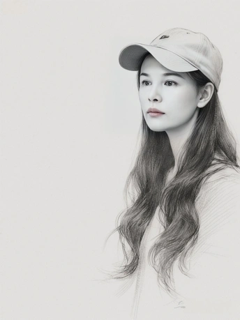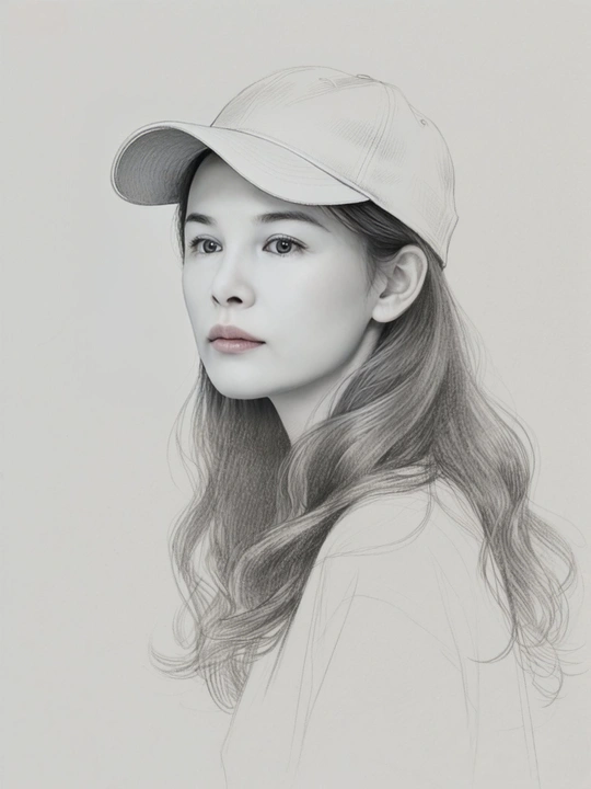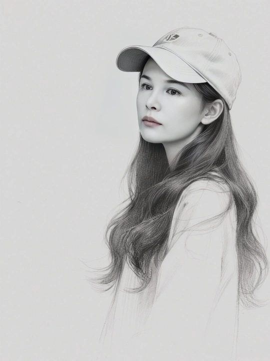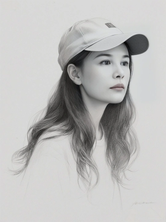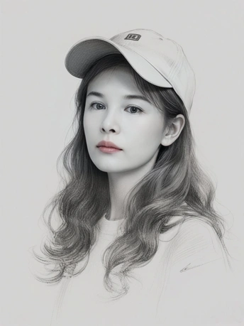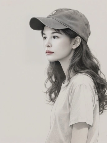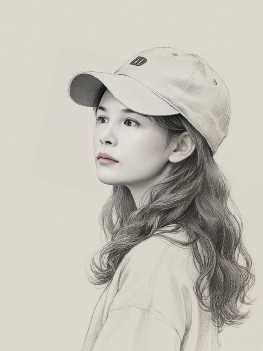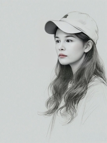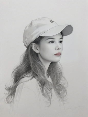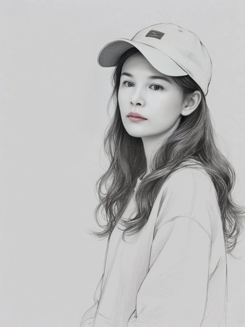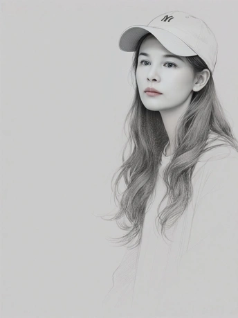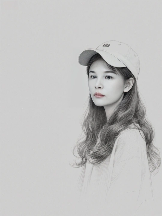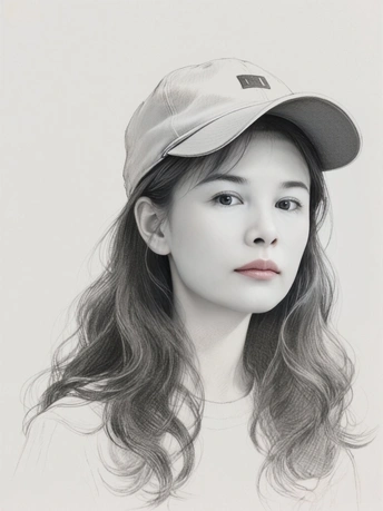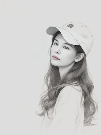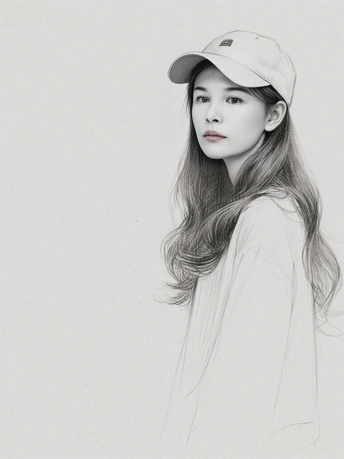 浅灰色背景,右上角长卷发层叠戴棒球帽女孩素描头像,大面积留白