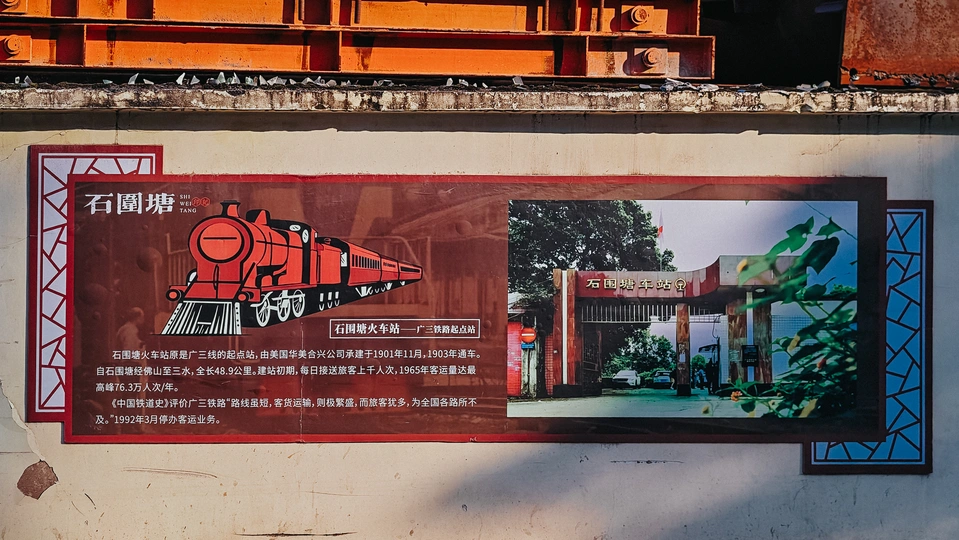 踏入石围塘火车站,往昔喧嚣不再,却处处留存着时光雕琢的痕迹。百年前,它作为广三铁路起点站,见证无数旅人奔赴远方,客运鼎盛时,每日人潮涌动。 如今,老旧铁轨锈迹斑斑,斑驳厂房静默伫立。但那历经风雨的模样,又似在无声诉说着工业时代的辉煌。从人声鼎沸到寂静沧桑,石围塘火车站宛如一部活着的史书,任岁月流逝,独守着属于自己的厚重记忆,等待着人们去探寻与聆听。