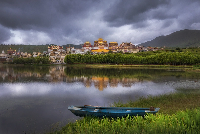 乌云如墨暗锁寺前川,金殿临湖,倒影似在自怜。小艇横斜芦荻畔,夏光偷换,几重烟岚悠悠。