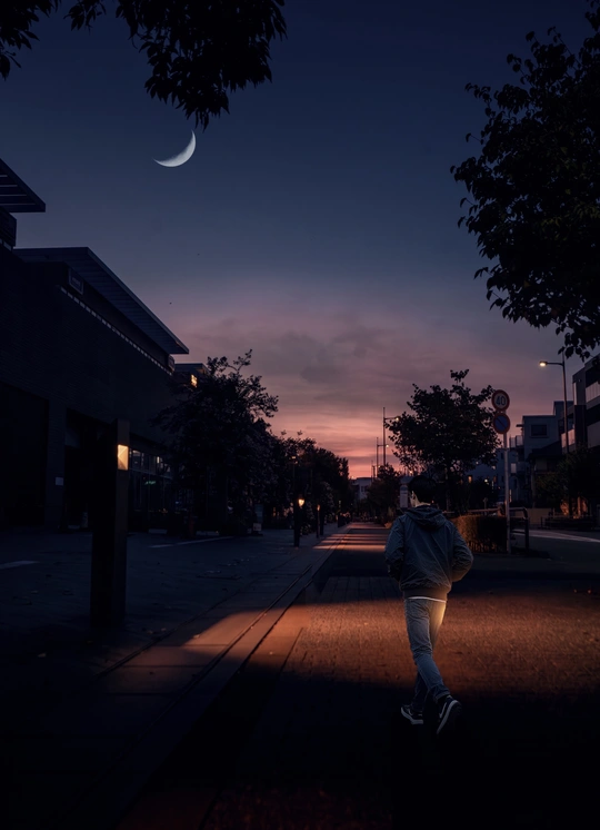 这幅图展现的是城市黄昏或夜晚的街景。天空中挂着一弯新月,天边还残留着日落时的粉紫与橙红霞光,给夜色增添了柔和的过渡色彩。街道旁的建筑、树木在灯光和暮色中形成剪影,路灯散发出暖黄的光,照亮了行人的身影。整体氛围静谧又带有一丝浪漫,仿佛能让人感受到夜晚城市里的宁静与烟火气,行人的存在也为画面增添了生活的动态感。