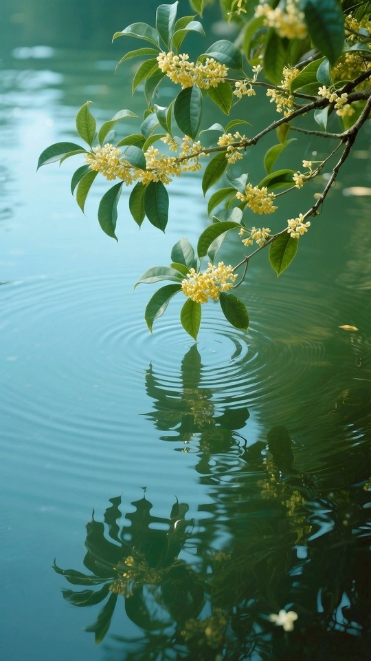 桂树枝条垂水边, 小花金黄映清涟。 微风轻拂起涟漪, 香气悠悠漫云天。