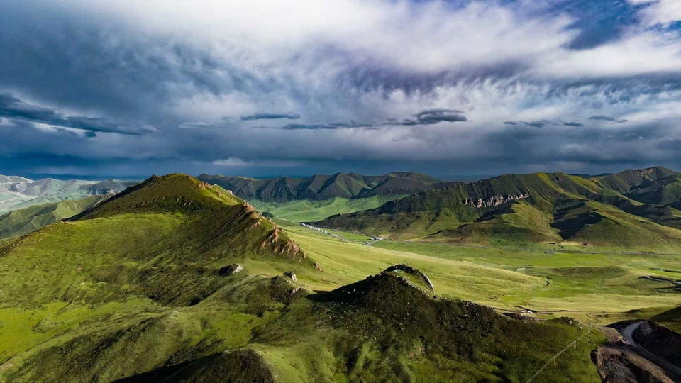 画面展现出一片广袤无垠的绿色山地景观,起伏的山峦被浓郁的绿意覆盖,如大地的绿色波浪。天空中云层层次丰富,光影交错,给这片山野增添了几分梦幻与壮阔之感,仿佛一处遗世独立的绿野天境,尽显大自然的雄浑与生机。