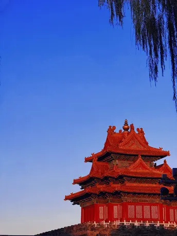 红墙鎏金,飞檐逐云——故宫角楼在湛蓝晴空的画布上勾勒出六百年风雨雕琢的轮廓。榫卯交错层叠而上,柳丝垂落轻拂时光,每一处翘角与斗拱皆是东方美学沉默而磅礴的诗句。这是皇城与苍穹的对话,是历史与光影的共舞,定格了永恒的建筑韵律。