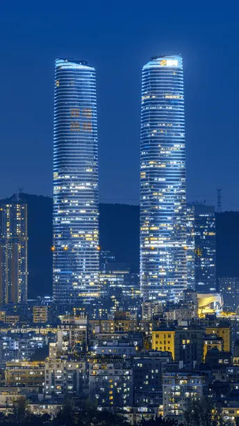 蓝调时刻的星河双子塔耸立在城市的天际线。
