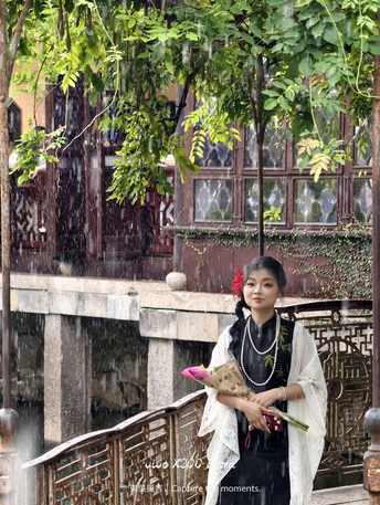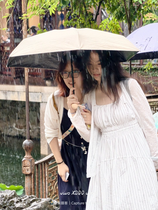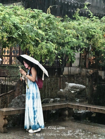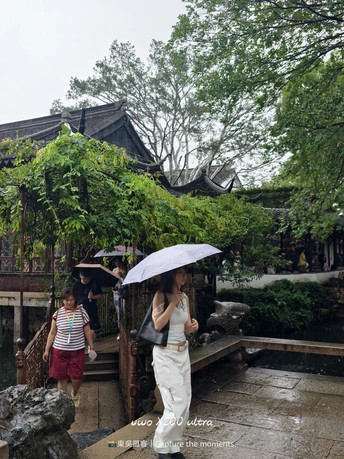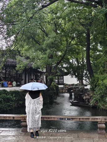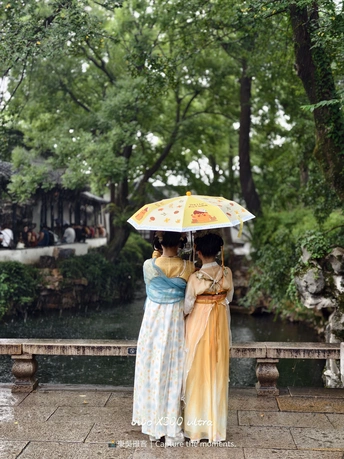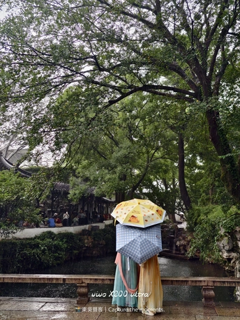 雨落江南,拙政园成了一幅晕染的水墨画。雨滴敲打着水面,也落在游人的伞上。有人着汉服共伞赏景,有人持花在雨中定格瞬间,还有人撑伞漫步,让古意与烟火在雨丝里温柔交织,每一幕都是江南独有的诗意日常。