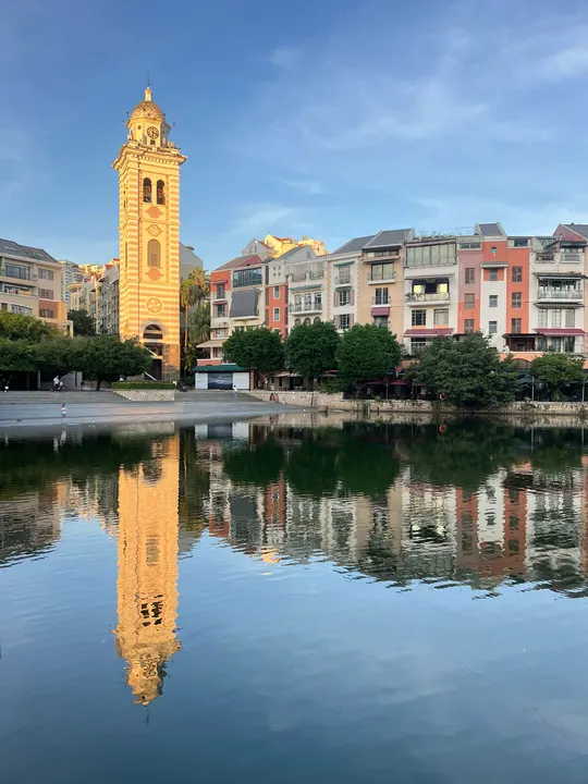 绝美,大抵是恰逢所有“刚刚好”撞个满怀。 夕阳正吻上钟楼的檐角,余晖漫过砖缝,给轮廓镀上暖金;湖面敛了风的踪迹,平得像块铺开的镜,把天、钟楼与岸边的树,都完整地抱进怀里。 湖边的小姑娘静静立着,身影轻得像片待落的叶。而我抬手举镜的刹那,恰好将这抹夕阳、一湖镜光,连同她独立的侧影,都框进了取景器里。 原来最美的瞬间从不是刻意寻来的,是风停得刚好,光落得刚好,人站得刚好,我按下快门的时机,也刚好。