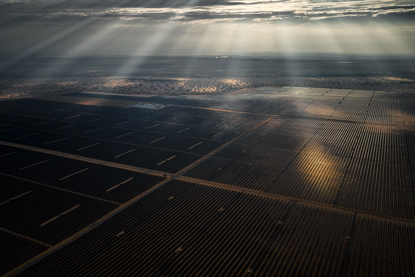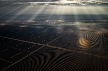 内蒙古阿拉善地区的腾格里沙漠,巨大的光伏电站为沙漠穿上了黑色的铠甲。我们早上5点驾车到达这里等待日出,但天边的云层让我们的愿望落空。不过功夫不负有心人,7点之后太阳慢慢刺破云层,撒下奇幻的丁达尔光,与颇具未来感的沙漠光伏电站一起组成了超现实的画面。 这张照片是《绿色未来》系列的一部分,系列作品会于9.19-9.23在平遥摄影节展出,欢迎大家线下观看[机智]