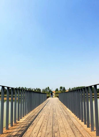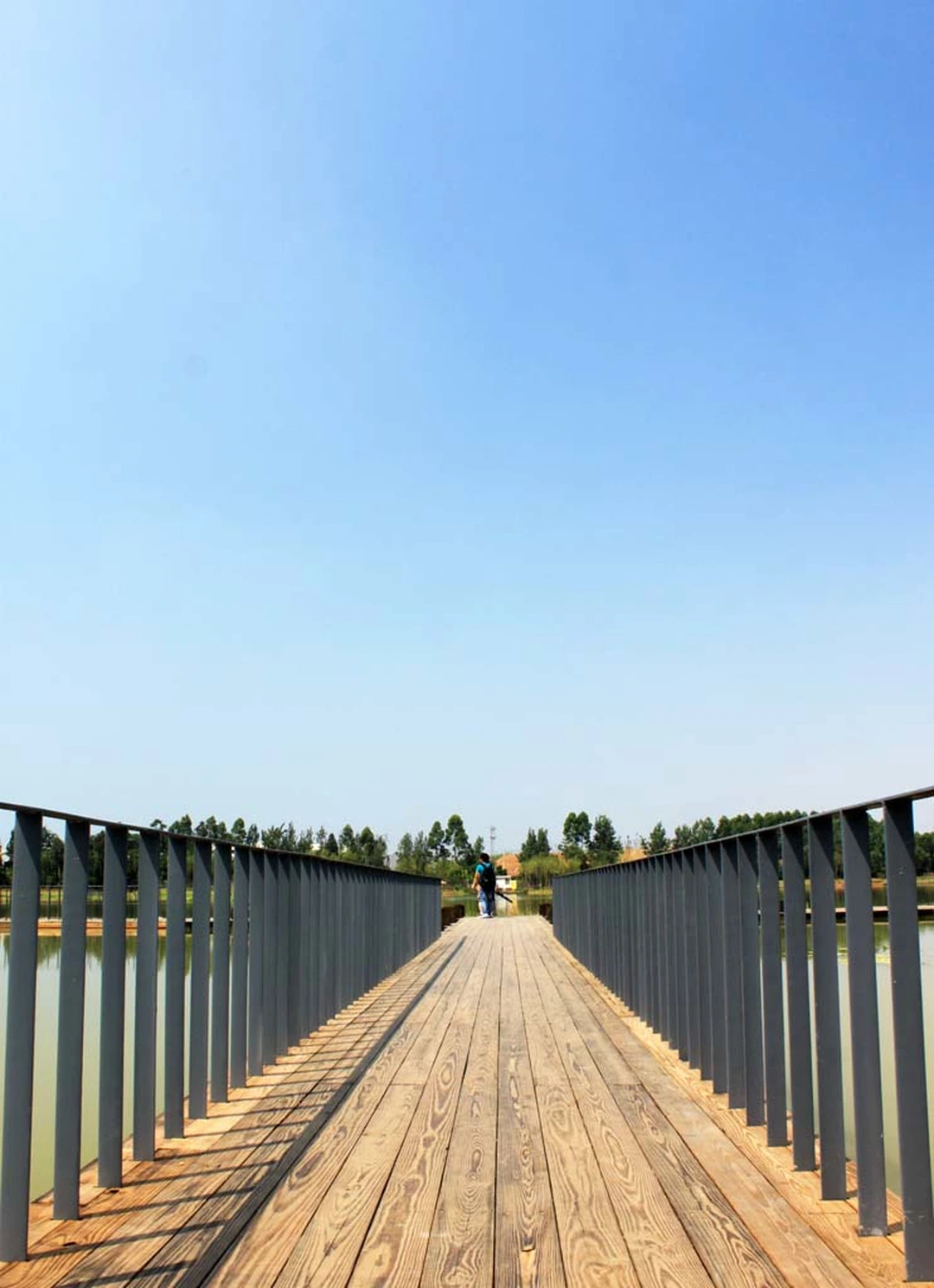 一摄影人,走在成都外东三圣乡,荷塘月色景区的木板栈道上。此时正是蓝天悠然。