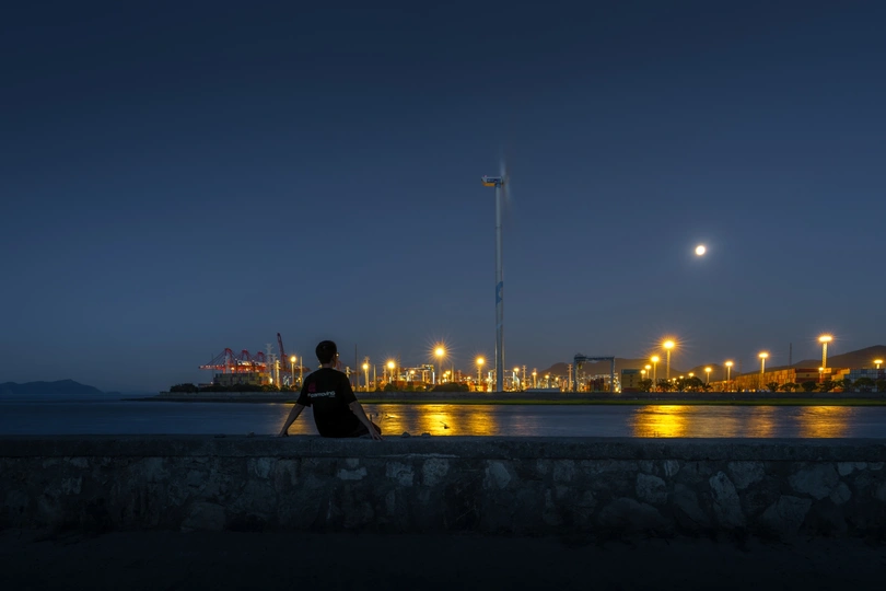 蓝调时刻宁波的海边和港口同框 很喜欢这种氛围感