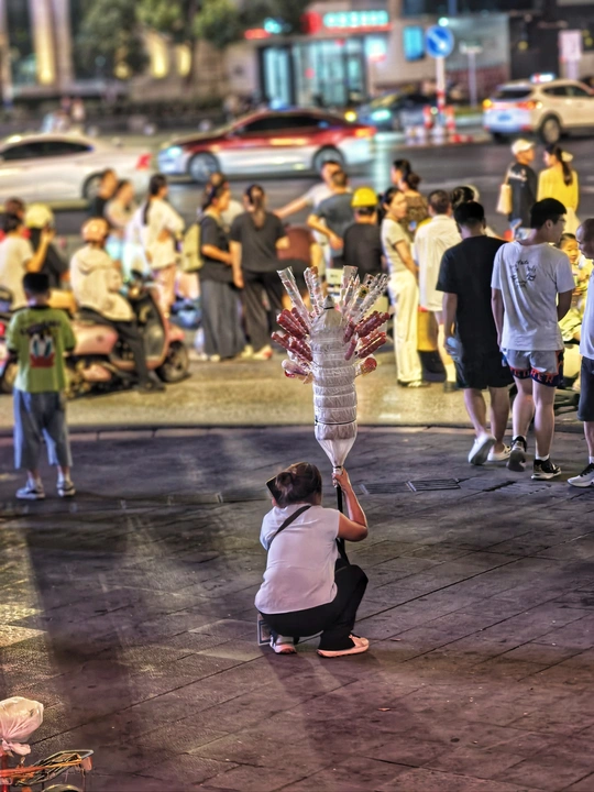 #祎璠纪实# #手机365-3231# 夜幕下的街头,冰糖葫芦的甜香在晚风里弥漫。蹲坐的摊贩守着那束晶莹的串儿,周遭是城市的喧嚣与烟火,一静一动间,藏着生活最真实的模样。