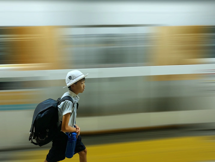 小学生为了上学,急切追赶时间的状态,既展现出上学途中的匆忙,也暗含着对校园生活的奔赴与期待,将孩童在日常上学场景里的那种紧凑又充满朝气的模样生动呈现。
