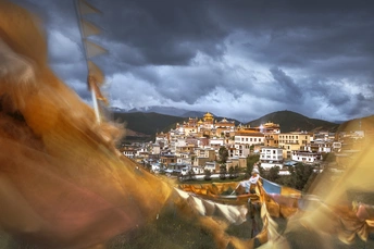 乌云笼罩,松赞林寺在雨幕中静静伫立,经幡猎猎作响,古寺在幽光里,藏着雪域独有的神秘与庄严。
