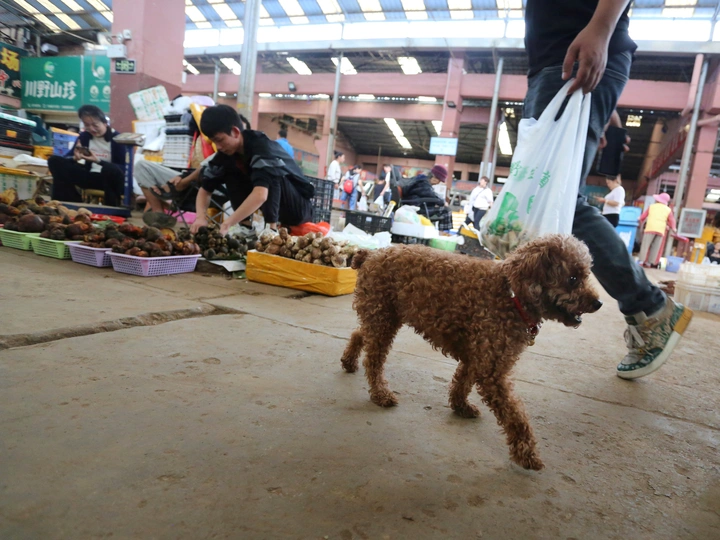 菜市场里,小泰迪欢快地跟着主人,周围是琳琅满目的山珍,烟火气与可爱值直接拉满~