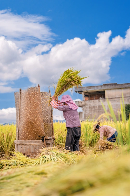 秋日里,蓝天之下,两位农人在金黄稻田中,一位农妇正在割稻子,一位将稻穗往传统工具上摔打脱粒,一派丰收劳作的景象。