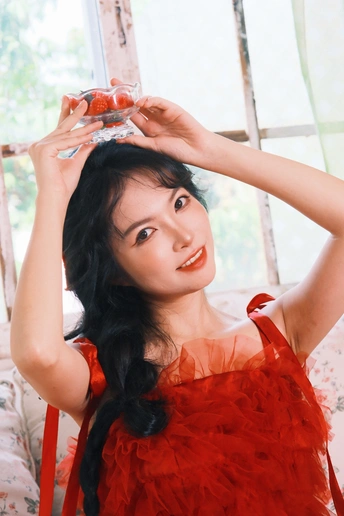 红裙、红莓,少女与美好撞个满怀,笑容里满是夏日的甜,每一处都洋溢着青春的鲜活气息