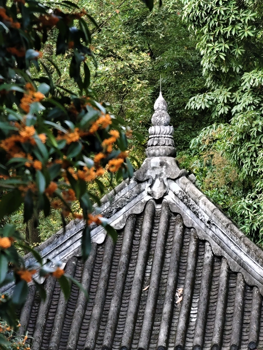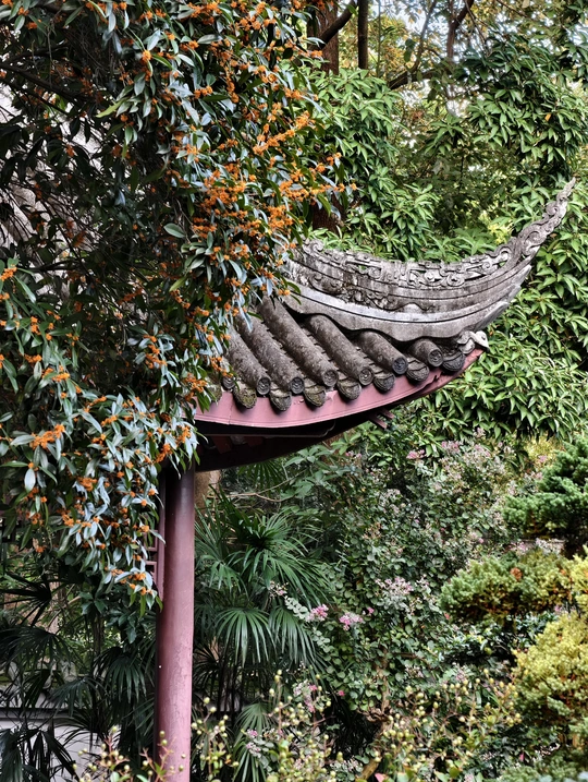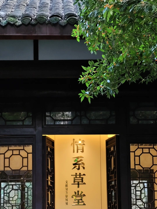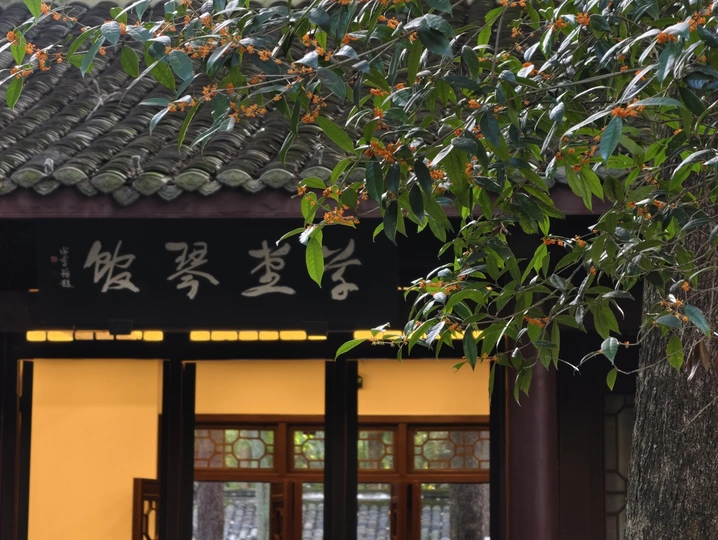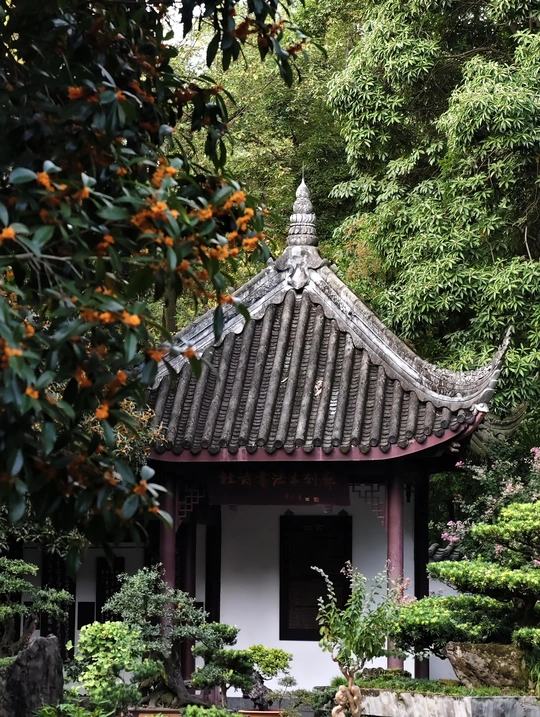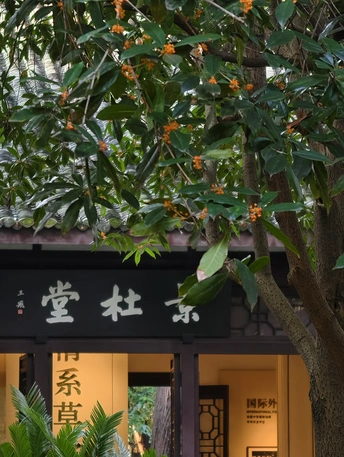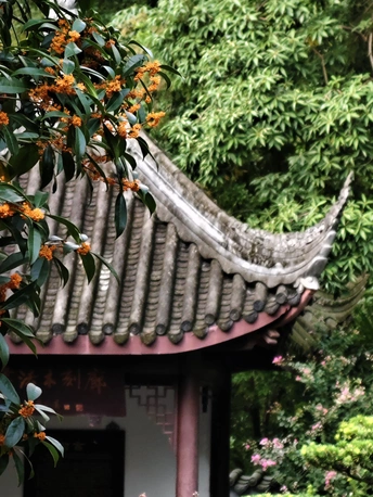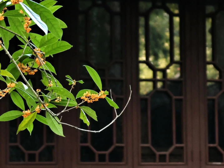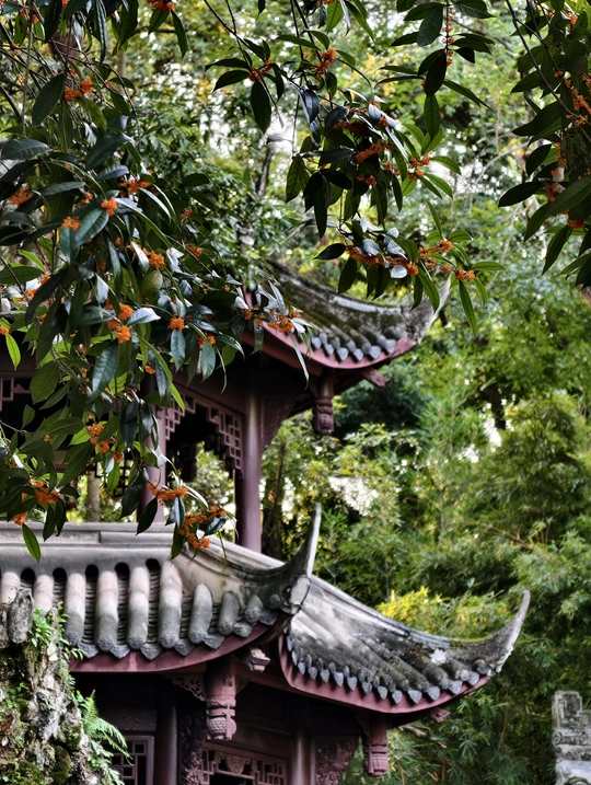 古建飞檐错落,桂花悄然点缀,杜甫草堂的秋韵在檐角与花香间静静流淌。