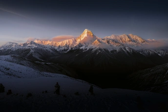 巍峨雪山如银龙盘踞天地,峰顶积雪在破晓金光中熔成炽焰,云涛翻涌间时而吞没山脊、时而泻出流霞。 尼康z7 拍摄于子梅垭口