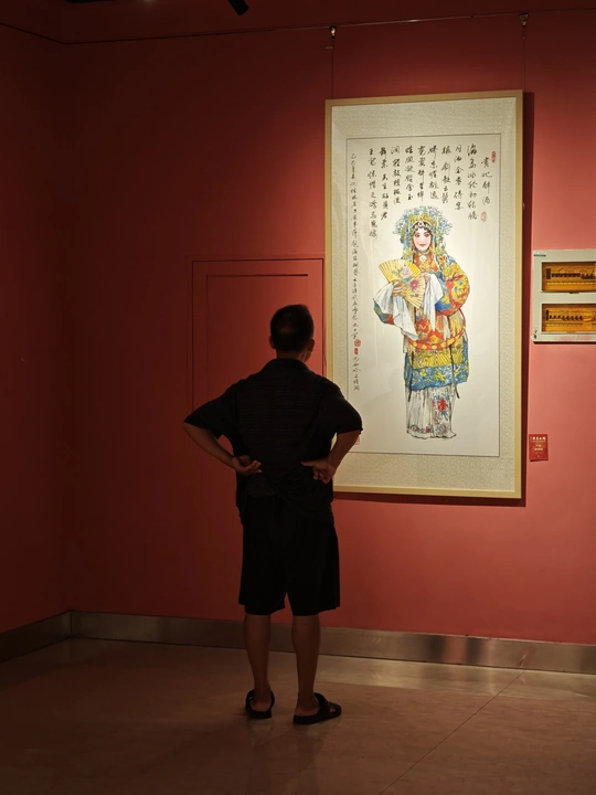 展厅里,一位参观者背着手,定定地望着墙上那幅戏曲人物画。画里的戏曲角色,头戴精致头饰,身着色彩斑斓、绣工精美的戏服,手持折扇,仿佛下一秒就要登台亮相。参观者瞧着瞧着,像是被画里的“角儿”勾了魂,看得入了迷,完全沉浸在这传统戏曲艺术营造的美妙氛围里。