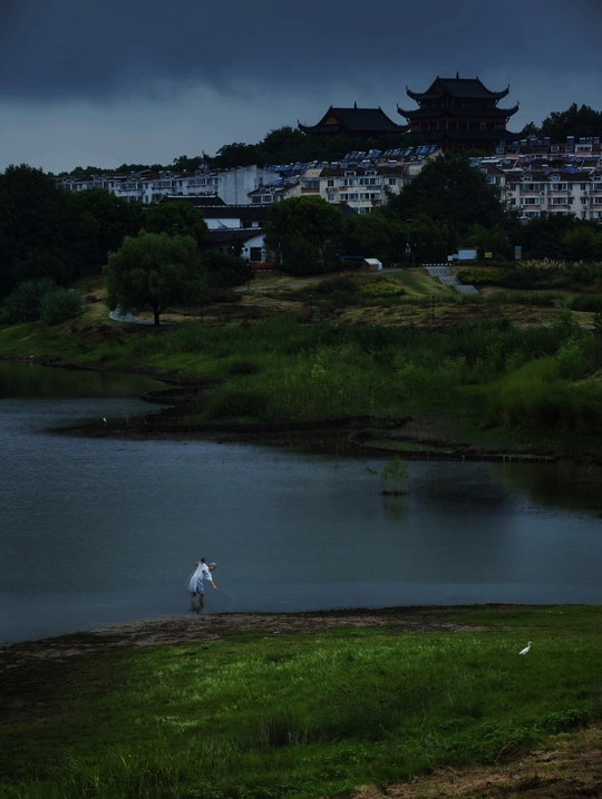 阴沉的下午,一人在河边布网,远处古建筑与现代住宅相映成趣,阴云密布的天空下,绿草如茵,白鹭悠闲,构成一幅宁静而悠远的风景画。