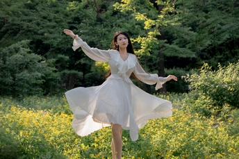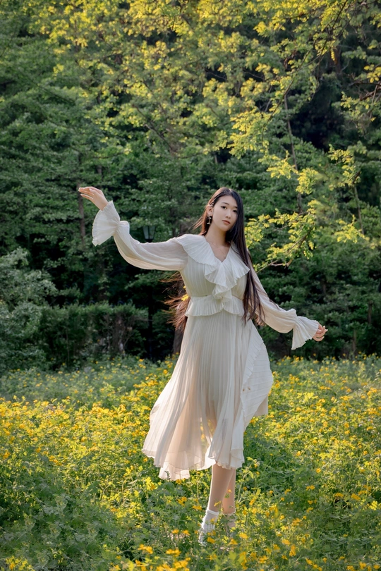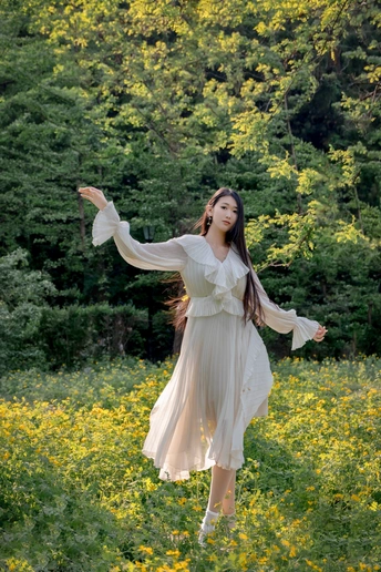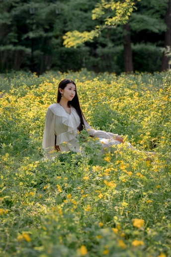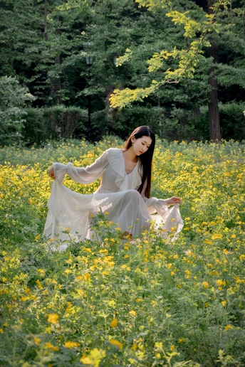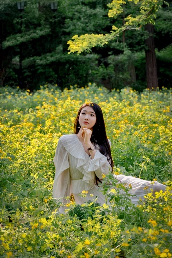 鞍山烈士山山后有一片不知名的小黄花。在这里拍人像,下午的时候光线正好是逆光。这个模特儿身高1米78。人长得漂亮。气质也不错。
