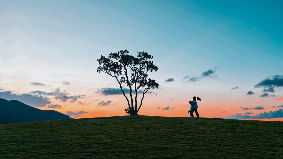暮色晕染天际,她抱着孩子,在广袤草坡上走向那棵树。仿佛走向一份笃定的依靠,走向岁月里绵长的爱与守护,每一步,都踩着温柔的光,也踩着生活里最暖的盼头。