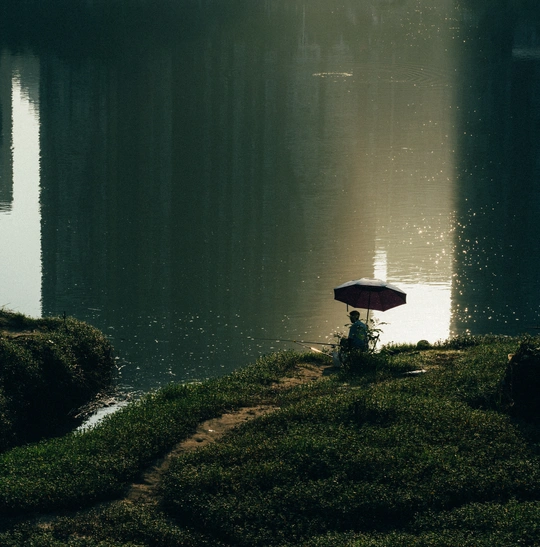 八点左右,太阳正从对面高楼后面升起,日光恰巧从楼宇之间投射到河面上。让我发现了他