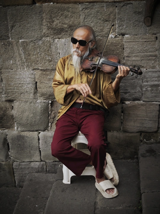 构图精准捕捉老人拉琴姿态,石墙作底,把岁月沉淀的故事框得扎实。色彩复古,金棕与酒红碰撞,衬出独特艺术气质。光影柔和,给白发、琴身裹上怀旧滤镜,氛围感是 “孤独又浪漫的街头奏鸣”。主题是艺术与岁月的共生。
