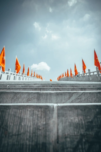 画面中,灰白色石阶蜿蜒向上,两侧白色栏柱间,橙红色旗帜整齐排列、迎风舒展。蓝天流云为幕,阶梯似通途,旗帜如火焰,既有着仪式般的庄重感,又在开阔天地间迸发出生动的色彩张力,仿佛在诉说一段关于传承、敬意与向上力量的故事,每一面旗帜、每一级台阶都在构建着视觉与精神的双重纵深感。 2025.9.1 Shot on Lumix S1
