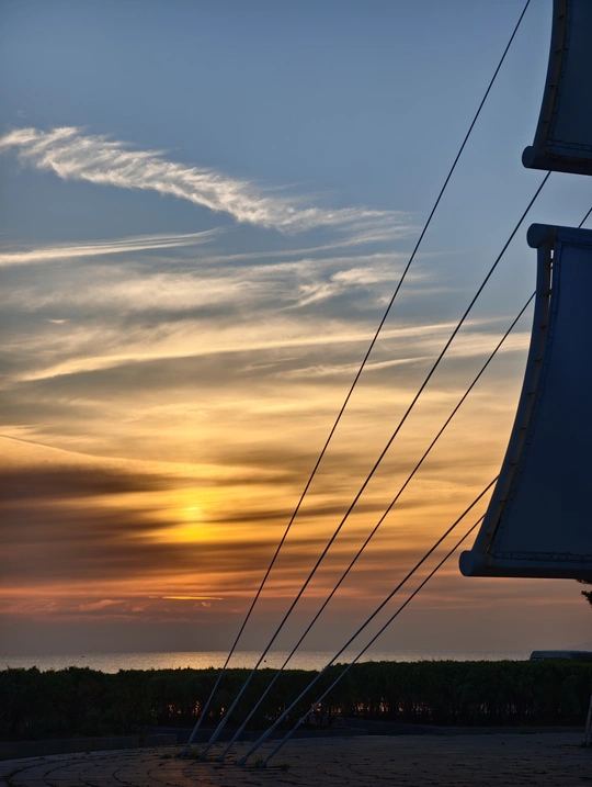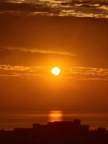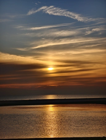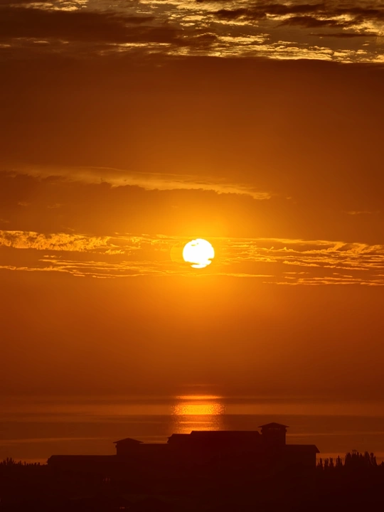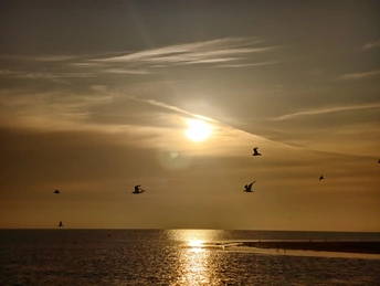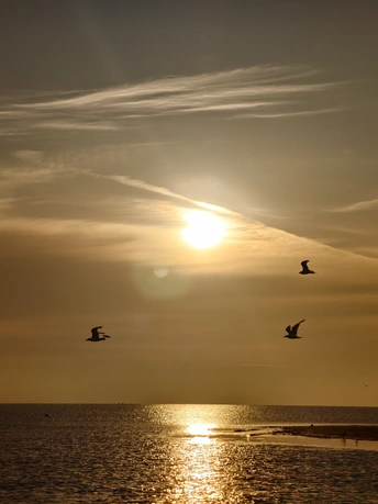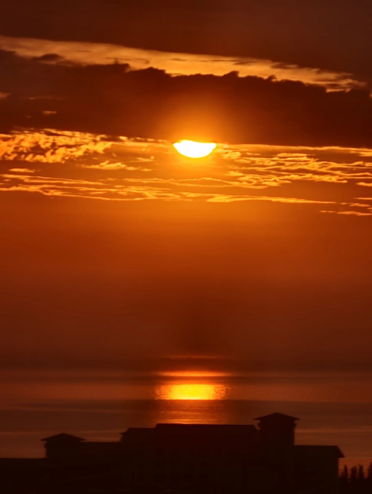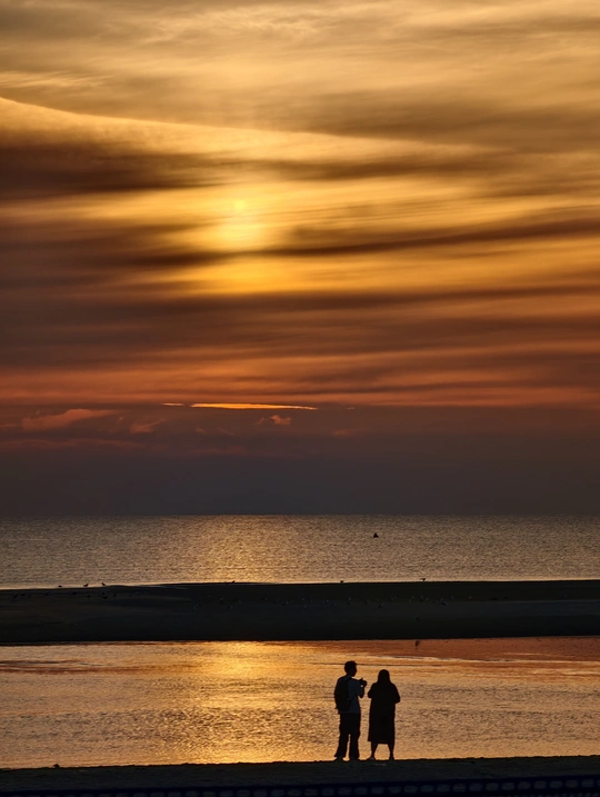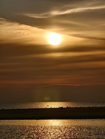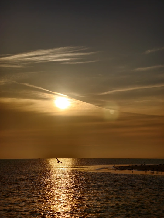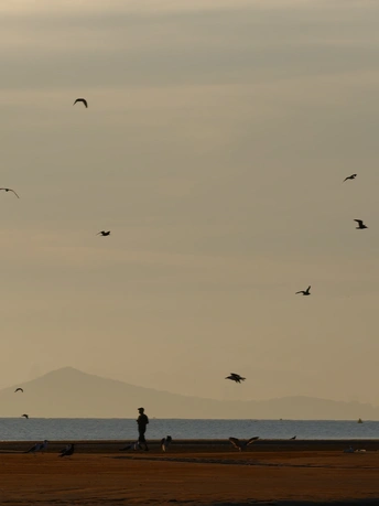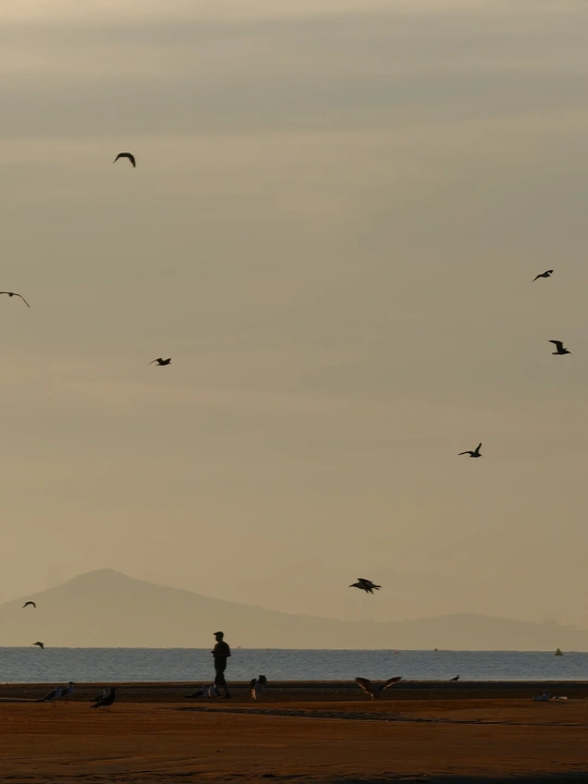 这是一场来自山东烟台的海边的日出,凌晨5点半,海水夜晚退潮,还没涨回来,露出一片沙丘小岛,沙滩被日出染红了,一人一狗在海边玩耍,惊起一滩候鸟,在天空中盘旋。