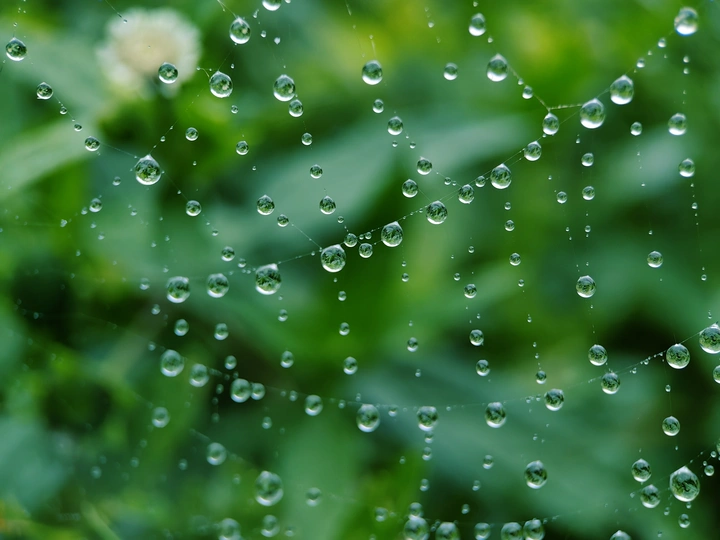 蛛网缀满晨露,似水晶串成的网,每一颗水珠里都藏着一个微观的清新世界。
