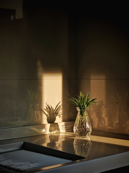 剔透雕花玻璃瓶中,青翠植株舒展着自然韵律,与琥珀色光晕在素净背景间共舞,定格森系美学中的温柔呼吸。