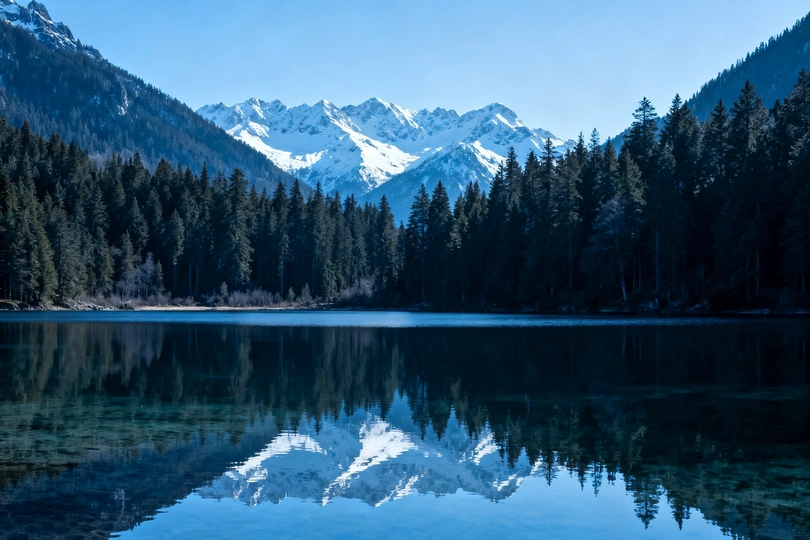 群峰戴雪,如银铸的屏障横亘天际;翠林拥湖,似墨染的绒毯铺展岸畔。一汪碧水如天地研磨的明镜,将雪山的巍峨、林木的葱郁悉数收纳,倒影与实景交融,分不清是山入了水,还是水映了山。在这片远离尘嚣的谧境里,风停树静,唯有蓝的天、白的雪、绿的林、清的水,于无声处奏响一曲自然的交响,每一道纹理都是时光的沉淀,每一缕光影都是天地的私语。