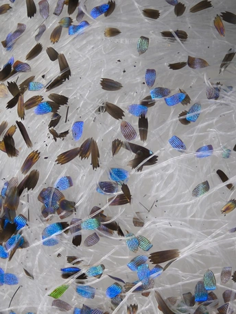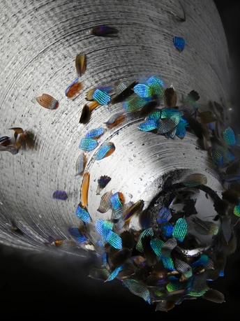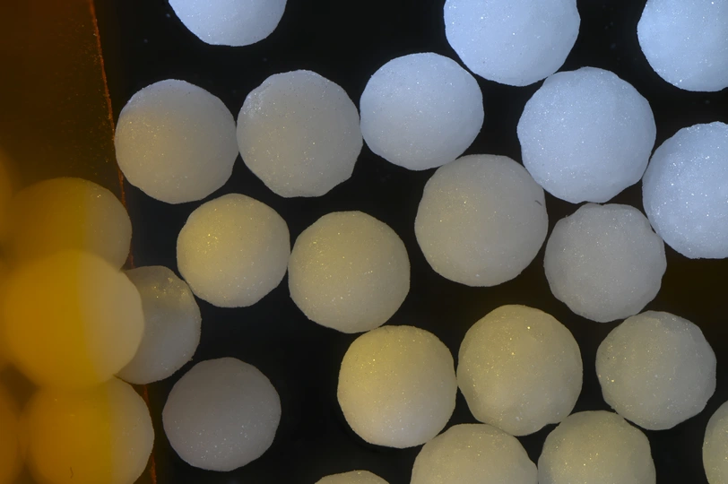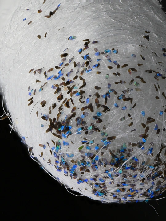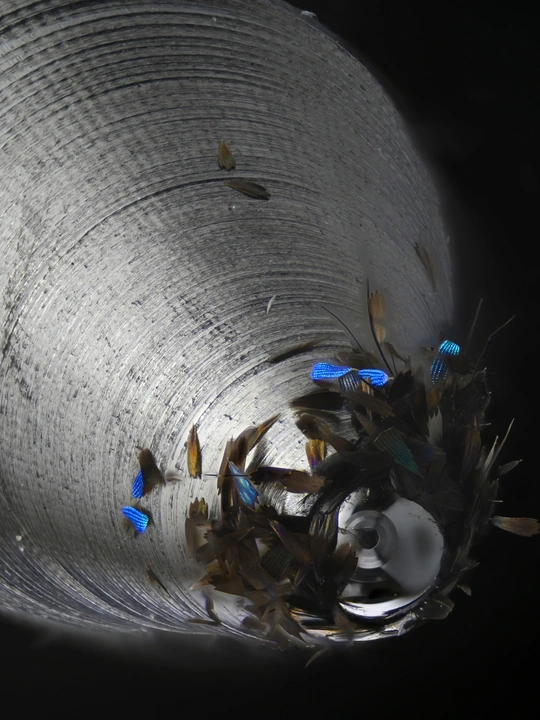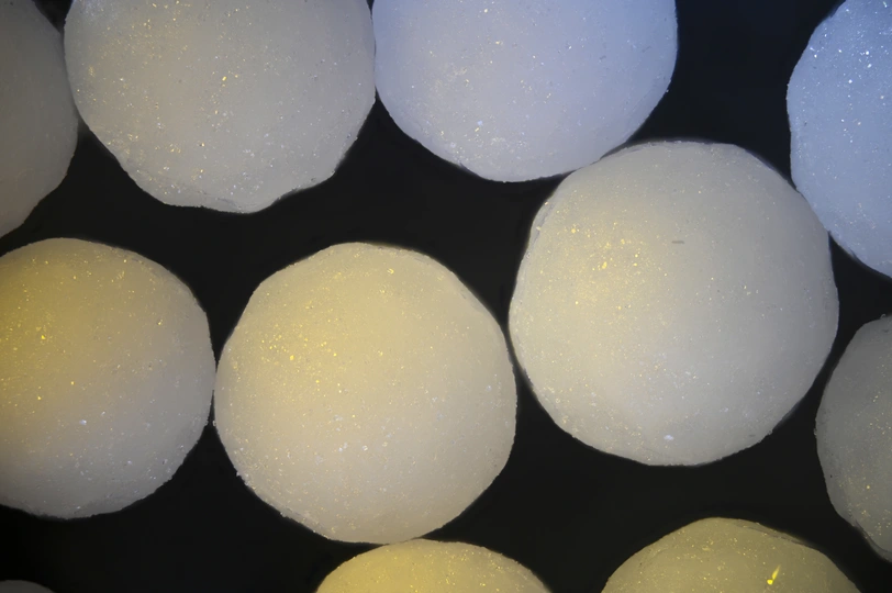 使用显微物镜改装的镜头拍摄的蝴蝶鳞片在不同材质上的影像 5.6为布洛芬缓释胶囊颗粒