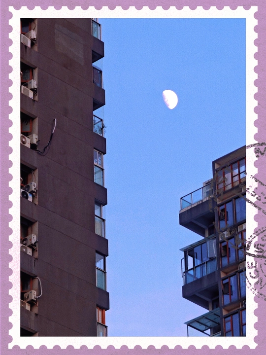 城市楼宇的缝隙间,一弯月牙悬于澄澈蓝天,似是给匆忙的都市生活,嵌上一枚温柔的邮戳,寄来片刻的宁静与诗意。