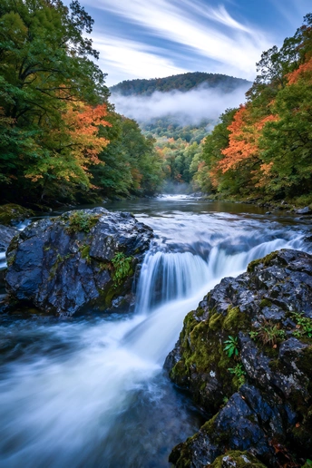 秋意浸染山林,将枝叶绘成斑斓的画布;溪流跃过青石,在山谷间奏响灵动的乐章。云雾轻笼远山,似给层林蒙上一层朦胧的纱,流水的白练与岩石的苍黛相映,每一处色彩、每一缕声响,都在诉说着秋日山林里,自然最温柔的私语。