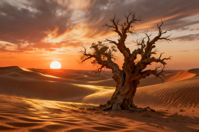 大漠黄昏,落日将最后一缕炽热泼洒在沙原上。胡杨如沧桑的歌者,以枯槁的枝桠作音符,在余晖里奏响生命的绝唱。它扎根沙海千百年,看尽日出月落,在黄昏的怀抱中,每一道纹理都是与时光博弈的勋章,把荒芜的沙漠酿成了诗意的疆场,让落日的温柔与胡杨的苍劲,在天地间定格成一曲震撼灵魂的沙海燃歌。