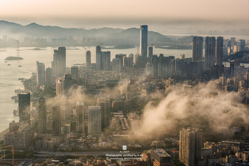 借高起飞,拍摄厦门鹭江思北天际线,刚好碰到一点平流雾