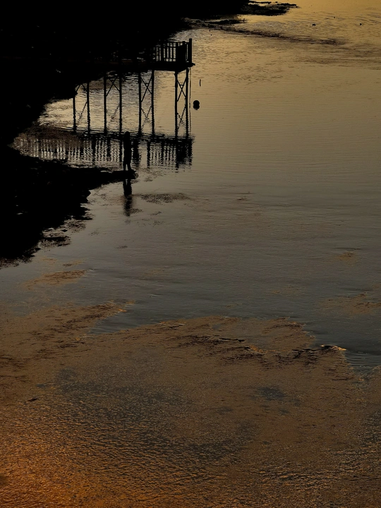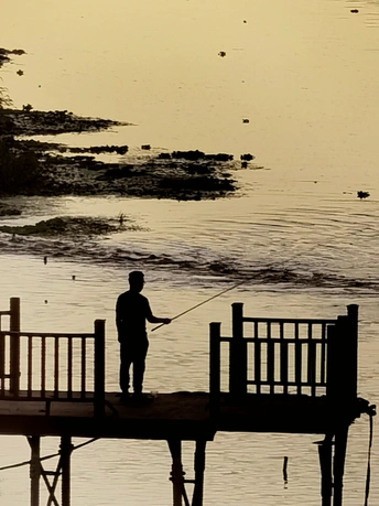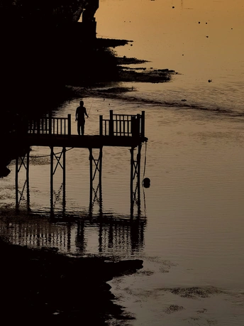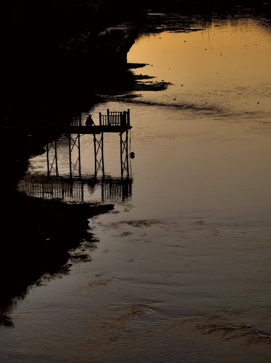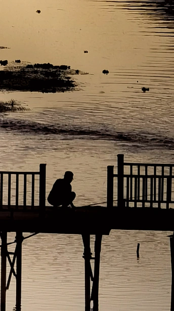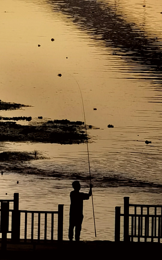 像是个模特,做出各种姿势,挺美的剪影! 当黄昏将天空晕染成暖橘色,河面如一块温润的琥珀。小木栈桥上,垂钓者的剪影与桥的轮廓一同倒映在涟漪里,时光仿佛在此刻慢了下来。他手握钓竿,在这片静谧中与自然对话,每一丝水波的颤动,都是黄昏写给生活的温柔诗行。